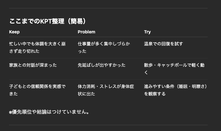 KPTの型自体はいつも通り使い、一人で考え込まず、AIに対話と整理を支援してもらうという点だけを変えています。