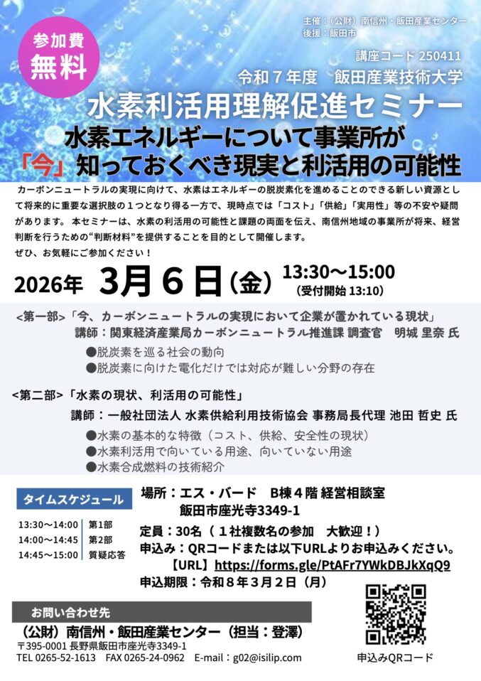 令和8年3月6日(金)、エス・バードにて「水素利活用理解促進セミナー」が開催されます。南信州地域の事業所を対象に、水素エネルギーの可能性と現実的な課題の両面を学べる内容です。