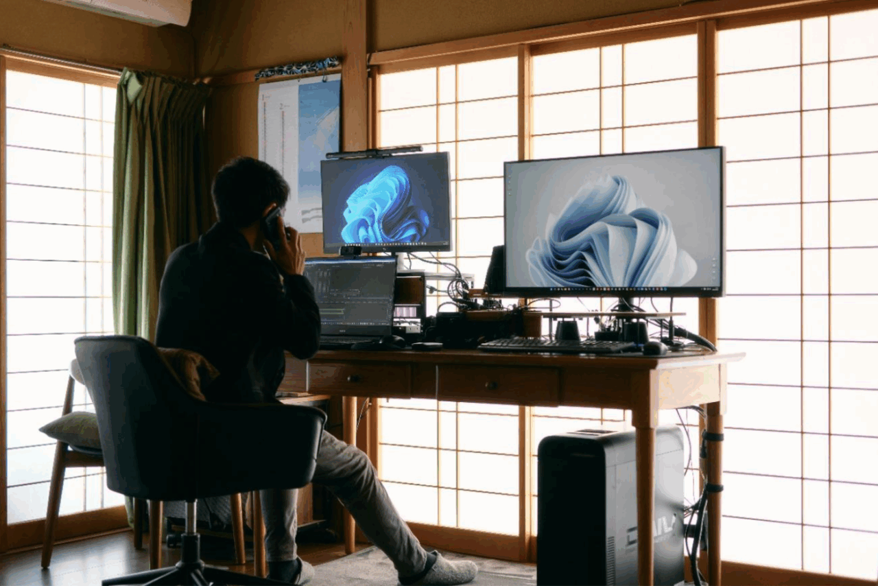 今までは撮影スタジオで技術コンサルやプロデュースワーク、ディレクションなどやっていましたが、そういった現場にいないとできない仕事から、営業や管理、最近だとAI を使った仕事やCG 制作、映像編集といった仕事に軸を変えたことで、リモートワークが実現したんです。月2回くらいは東京と飯田を行き来する、多拠点での働き方になりました。定宿のホテルに4、5泊して1案件に立ち合い、こちらに帰ってきて編集をする、というサイクルの繰り返しです。