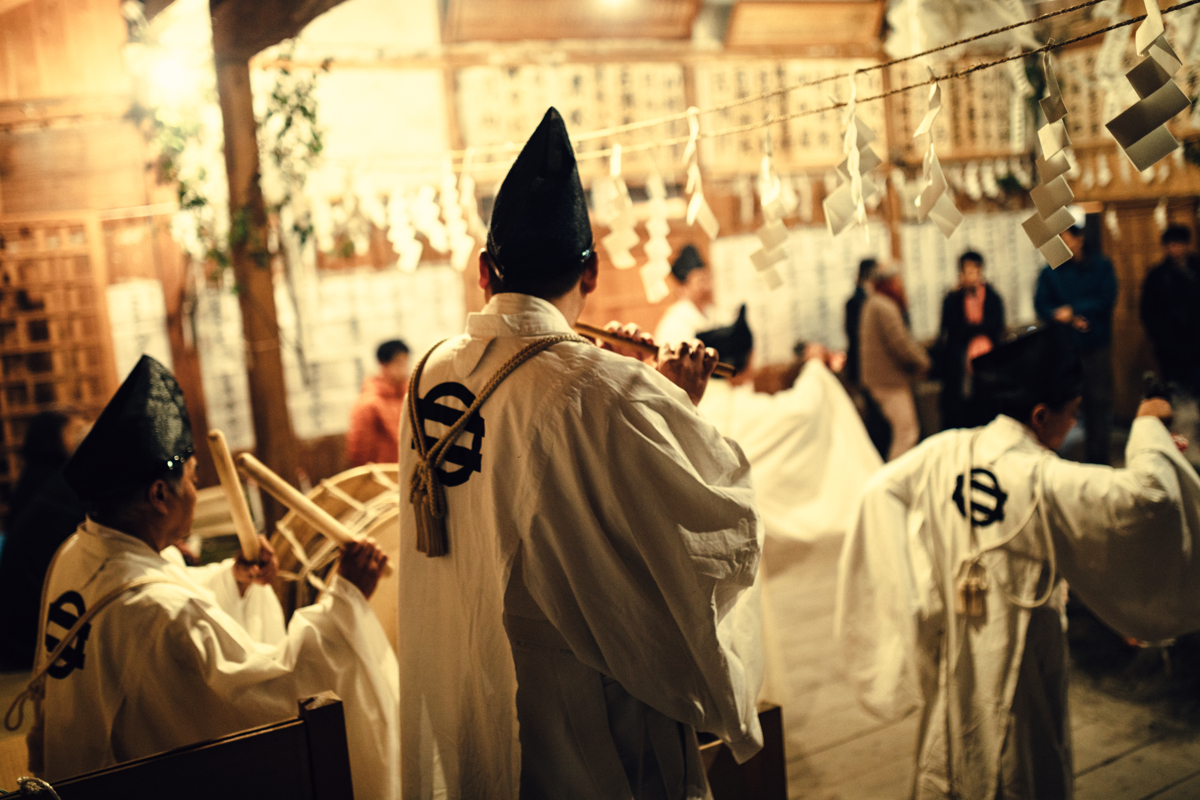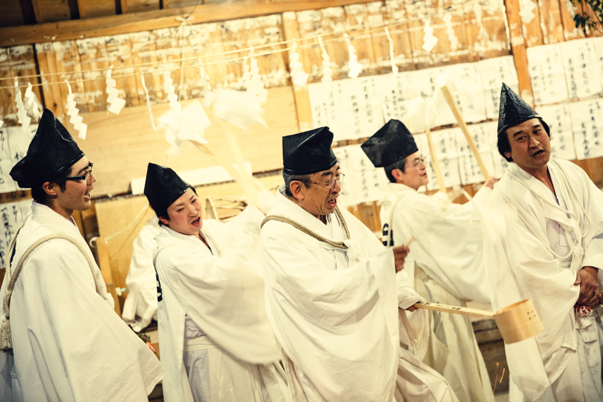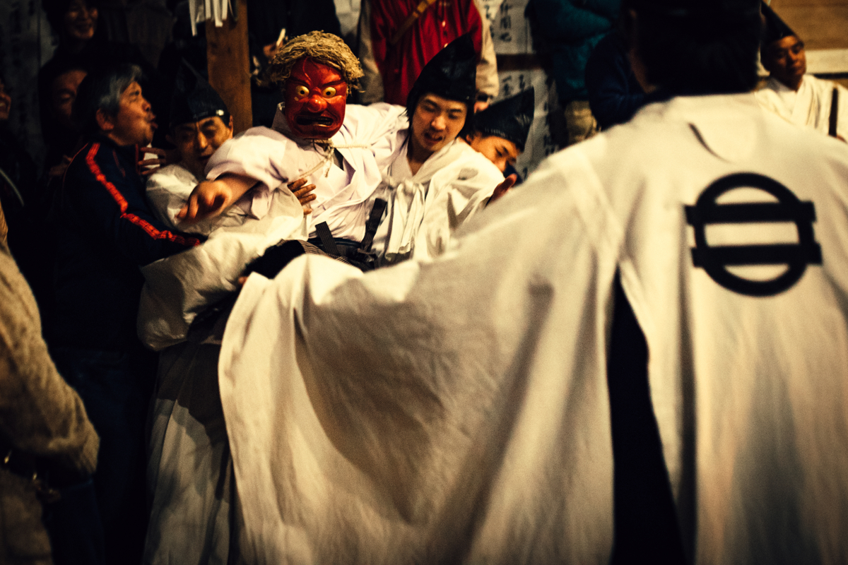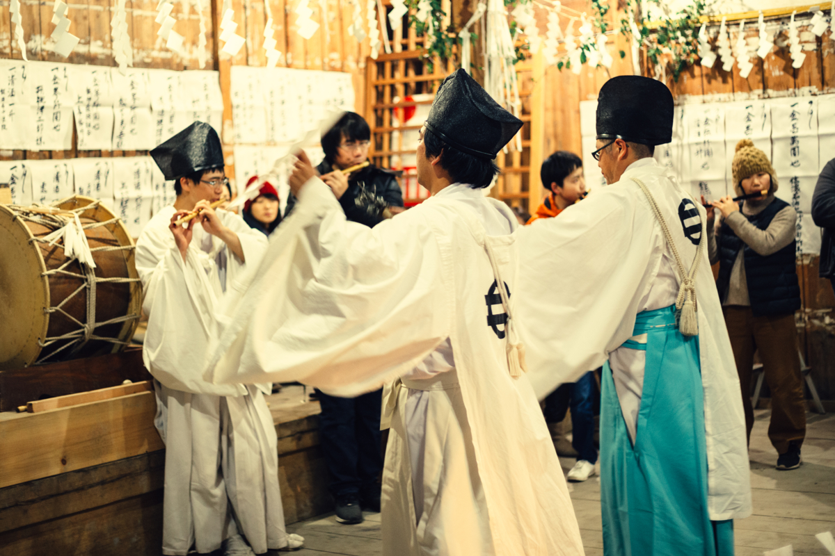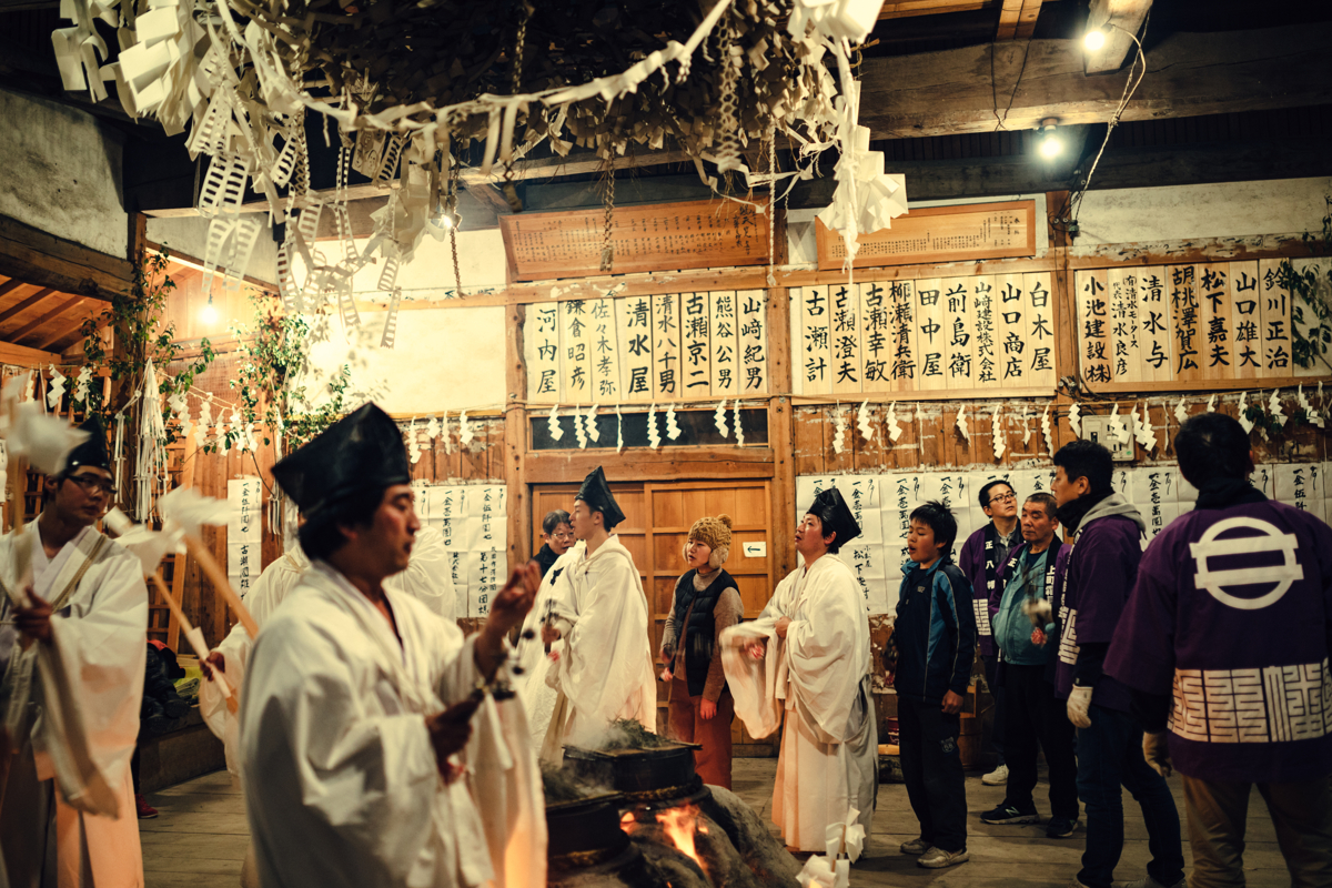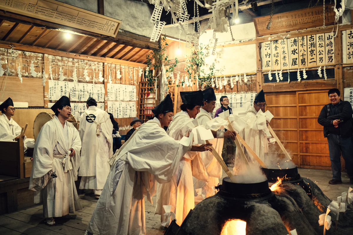 祭りでは社殿の中央に据えられた釜の上には神座が飾られ、湯を煮えたぎらせ神々に捧げます。見どころは、祭りのクライマックスになると天狗などの面が登場し煮えたぎる湯を素手で“はねかる”、「湯切り」。このときふりかけられた禊の湯によって、一年の邪悪を祓い新しい魂をもらい新年を迎えるといわれています。初めて参加される方は是非この禊の湯を浴びていただきたいものです。